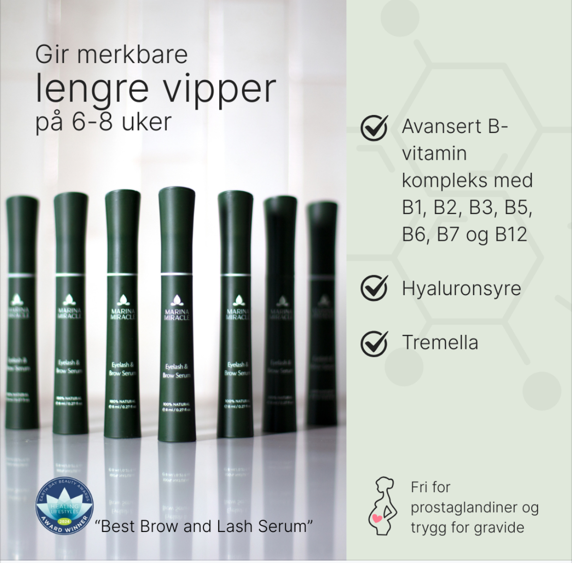 ○ B-Vitamin-kompleks inneholder B1, B2, B3 (niacin), B5, B6, B7 (biotin) B12, og flere – stimulerer hårvekst, styrker hårstråene og gir merkbare lengre vipper på 6–8 uker.